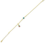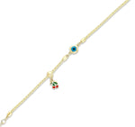 Детската гривна с висулки във форма на черешки и назар, изработена от 14 карата злато и цветен емайл, е много стилна и игрива. Комбинацията от тези символи носи както сладко и закачливо излъчване (черешките), така и защита (назарът), което я прави чудесен аксесоар за малки деца.