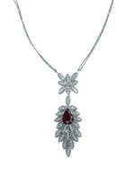 Диамантено колие Ruby seduction, съчетават класически блясък и изтънчен дизайн. Изработен от фино обработено 18 Карата бяло злато, това изящно бижу е обсипано с блестящи диаманти цвят F, и впечатляващ капковиден червен рубин 3.12 К, символизиращи страст, любов и изтънченост.