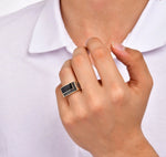 Централният акцент в пръстена са ониксите – камъни с наситен, мастиленочерен цвят и гладък, полиращ завършек.