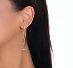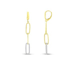 Това са елегантните златни обеци "Шик", представляващи висулка под формата на верига от три овални халки. Този уникален дизайн комбинира два цвята злато – бяло и жълто и гладък и релефен ефект на метала, създавайки зашеметяващ контраст, който привлича погледите. Всяка халка е внимателно оформена, като едната е инкрустирана с бели сапфири, които добавят изтънченост и блясък, другата е с ръчно оформен релеф, а третата е гладка. Изработени от 14-каратово злато, тези обеци са идеални за шикозен градски аутфит или за вечерен коктейл.