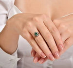 Този изключителен пръстен от изумруд, обгърнат от искрящи бели диаманти, придава уникален блясък на всяка визия. Съчетанието на наситеното зелено на изумрудите и блестящите диаманти е перфектно за специални поводи или за ежедневен шик.