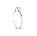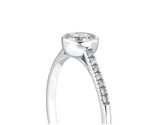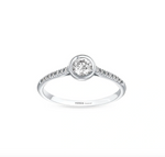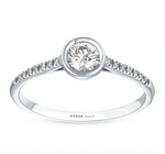 Този изящен диамантен годежен пръстен е перфектният символ на вашето вечно обвързване. С един централен диамант, внимателно и нежно поставен в кръгъл обков, пръстенът подчертава същността на чистата и искрена любов. Около централния камък се разкрива магията на халка, обсипана с малки диамантчета, които допълват блясъка и придават на пръстена още по-голямо очарование.
