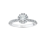 Със своето безупречно изящество, той включва един централен диамант, разположен в елегантен кръгъл диамантен обков, който усилва неговия блясък и величие. Халката на пръстена е полуобсипана с диаманти, които добавят искряща елегантност и изтънченост, подчертавайки изключителността на този момент.