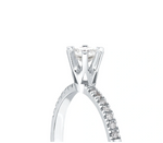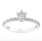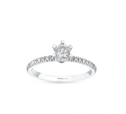 Този изящен диамантен годежен пръстен е перфектният символ на вашето вечно обвързване. С един централен диамант, внимателно и нежно поставен в обков от 6 държача, пръстенът подчертава същността на чистата и искрена любов. Около централния камък се разкрива магията на халка, обсипана с малки диамантчета, които допълват блясъка и придават на пръстена още по-голямо очарование.