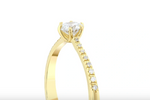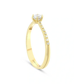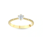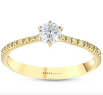Този изящен диамантен годежен пръстен е перфектният символ на вашето вечно обвързване. С един централен диамант, внимателно и нежно поставен в обков с 5 държача, пръстенът подчертава същността на чистата и искрена любов. Около централния камък се разкрива магията на халка, обсипана с малки диамантчета, които допълват блясъка и придават на пръстена още по-голямо очарование.